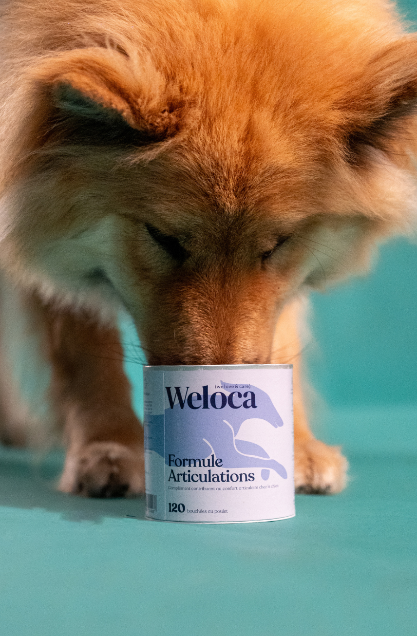 Contribuez à l'amélioration du bien-être articulaire de votre chien avec les bouchées de Weloca, une formule naturelle riche en chondroprotecteurs (glucosamine, chondroïtine, MSM, collagène, moule verte) pour contribuer au renforcement du cartilage et au ralentissement de la dégénérescence articulaire.