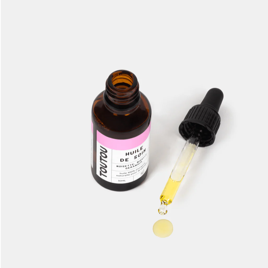 "Notre huile 100% naturelle combine les bienfaits de la noisette, du chanvre et du jojoba pour nourrir et faire briller le pelage, tout en régulant le sébum. La nigelle purifie et apaise, et l'huile essentielle de géranium parfume délicatement et protège naturellement, offrant ainsi un soin complet et unique pour vos animaux." - Jules & Juliette, les fondateurs